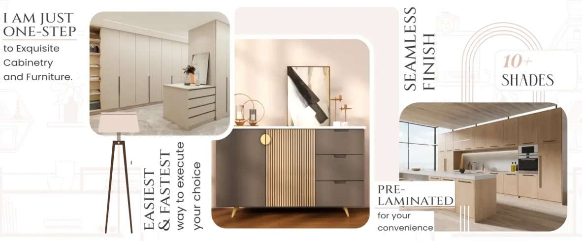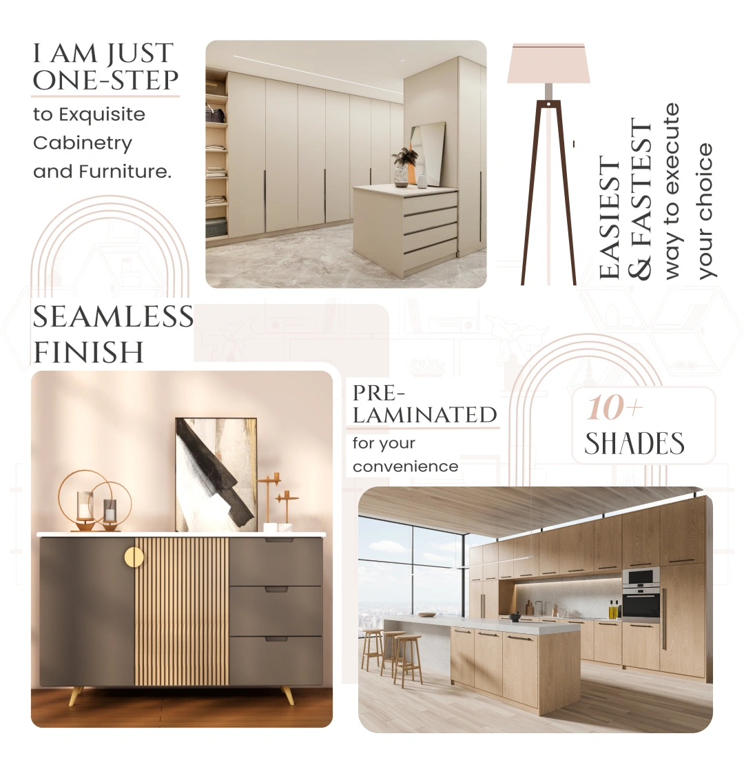 I AM JUST ONE STEP to exquisite cabinetry and furniture, prelaminated for your convenience, seamless finish. Easiest & fastest way to execute your choice