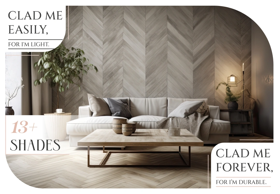 CLAD ME EASILY, CLAD ME FOREVER! Transform your walls with our premium collection of decorative wall panels, meticulously designed to enhance the aesthetic appeal of residential, commercial, and industrial spaces. More than just decor, these panels serve as bold design statements, adding character, depth, and sophistication to any environment. Crafted with precision and available in an extensive range of styles, our panels are designed for effortless installation, making it easier than ever to achieve a refined and polished look. Whether you prefer the natural warmth of wood, the timeless elegance of marble, or the contemporary boldness of metallic finishes, our collection offers an unparalleled variety of textures, colors, and patterns to suit diverse design preferences. Whether you desire a classic, rustic charm or a sleek, contemporary appeal, there is a perfect option for you. Choose from our brilliant range of colors and textures.